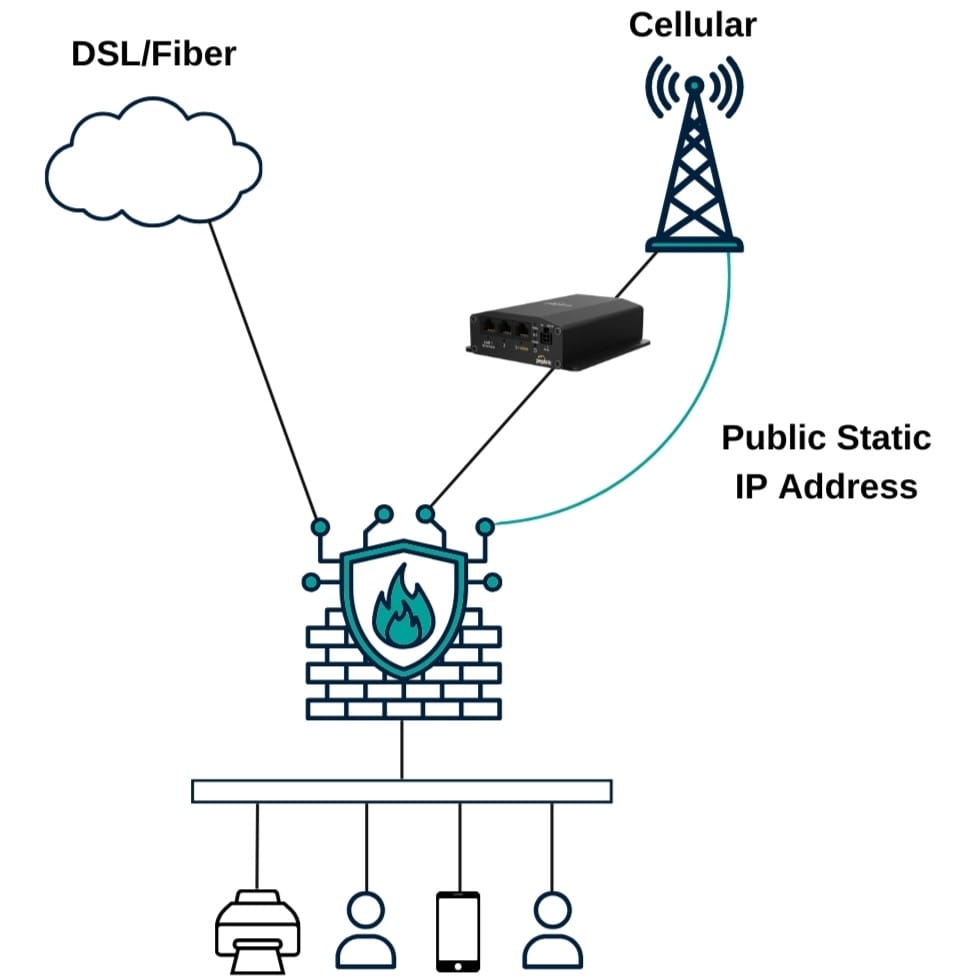 If one of the goals of cellular backup is to maintain inbound access for phones, network management, any other reason, there is a way to do that as well. For inbound access, a public static IP will be needed from the cellular carrier. This is a critical step and without it, inbound access is not possible.